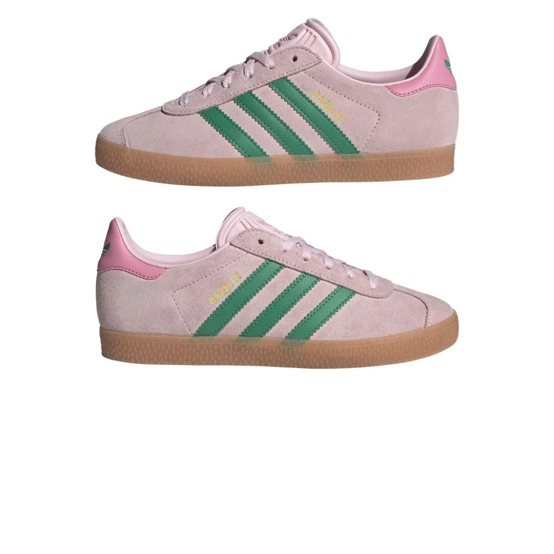 Adidas Gazelle Clear Pink Court Green prezentuje klasyczną sylwetkę Gazelle w zestawieniu kolorystycznym łączącym pastelowy róż z intensywniejszą zielenią. To wariant, który nadaje modelowi współczesny wygląd, zachowując jednocześnie cechy charakterystyczne dla oryginalnej linii.