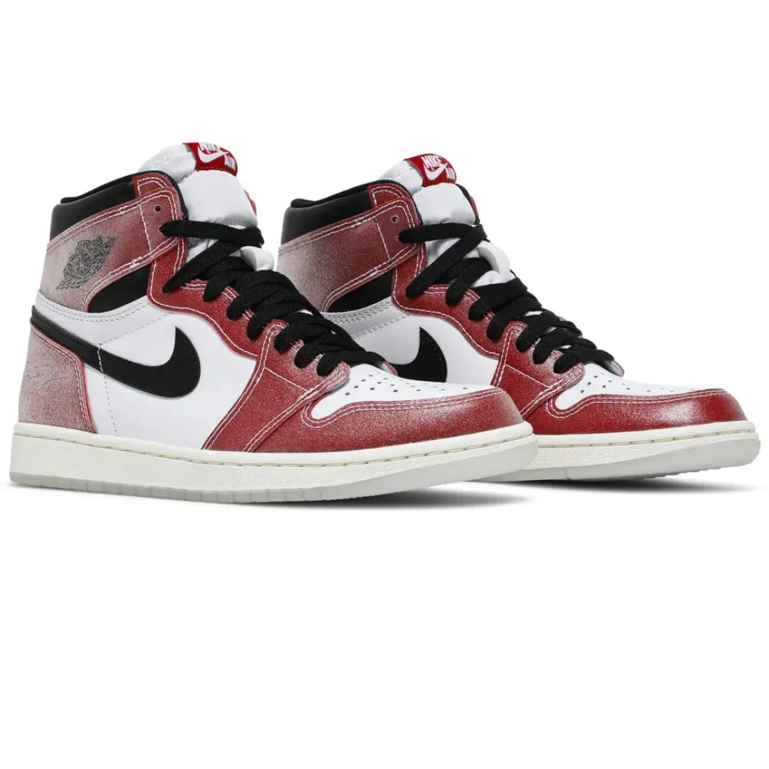 Zastosowano skórę licową z niestandardową fakturą o lekko zmrożonym, połyskującym wykończeniu. Kolorystyka opiera się na układzie Chicago, jednak białe i czerwone panele zyskują nowy efekt wizualny. Czarny kołnierz, Swoosh i sznurowadła zachowano zgodnie z oryginałem, a całość uzupełniają unikalne przeszycia oraz tłoczenia.