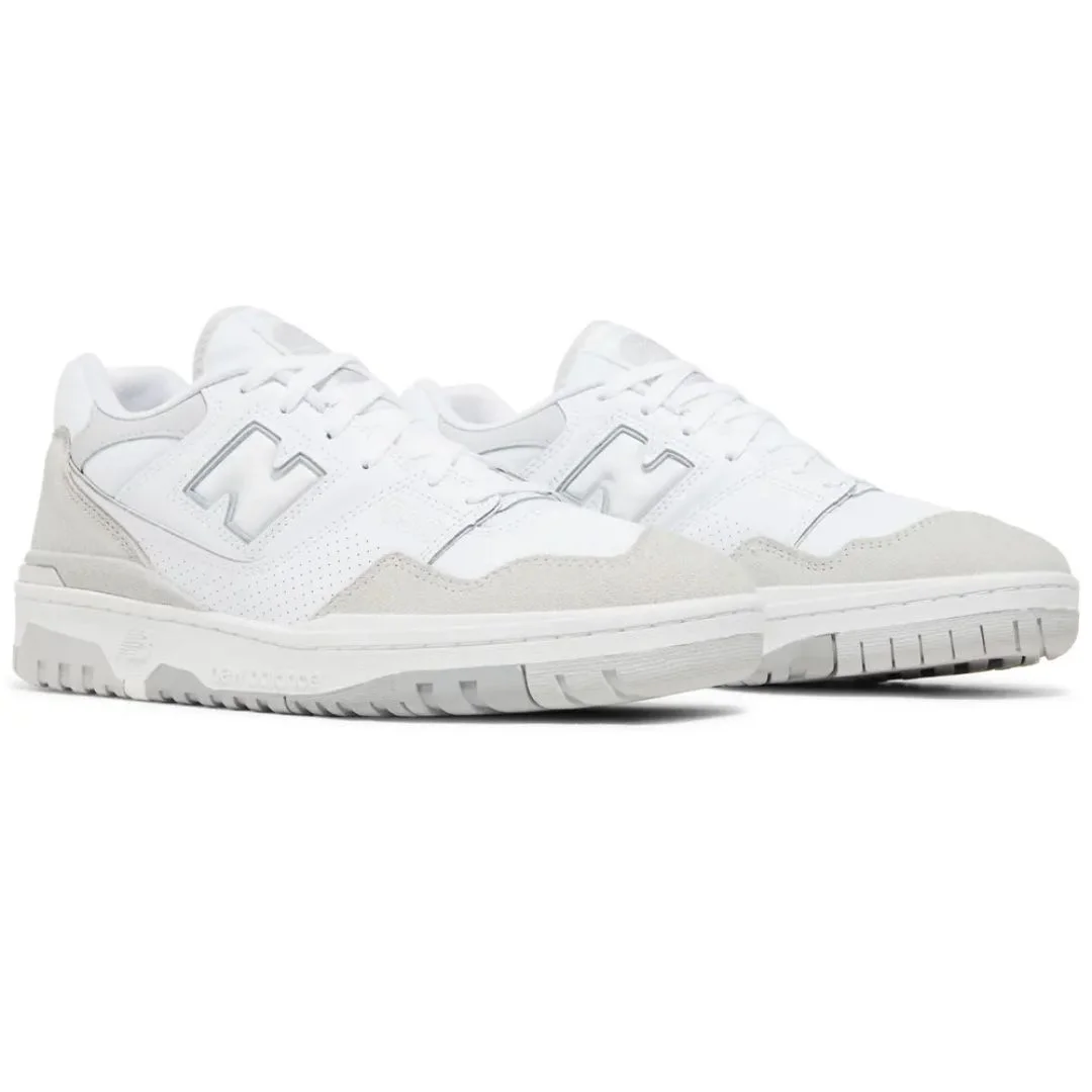 Wykorzystano białą skórę naturalną jako główny materiał cholewki, uzupełniony o perforacje poprawiające przewiewność. Odcienie szarości w wersji Summer Fog pojawiają się na języku, pięcie i bocznym logo „N”, tworząc subtelny kontrast. Kompozycja jest wyważona i łatwa do stylizacji.