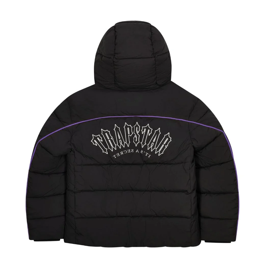 Model wyróżnia się nietypowym połączeniem głębokiej czerni z intensywnym fioletem, który widoczny jest w detalu oraz wnętrzu kaptura lub elementach logo (w zależności od wersji wypuszczonej w danym dropie). Tylna część kurtki zdobiona jest dużym napisem Irongate Arch, typowym dla serii Trapstar – wyraźnym, ale estetycznie wpisanym w ogólny design. Kontrast kolorów nadaje kurtce nowoczesny, przyciągający uwagę charakter.
